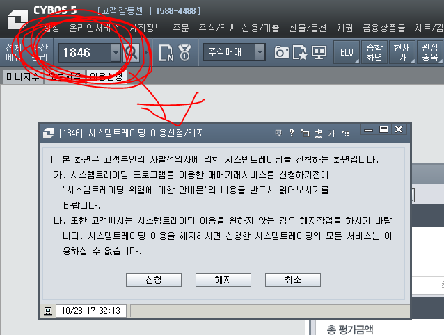 - CYBOS에 접속하면, 왼쪽 상단에 화면검색기에서 "1846"을 검색하여 시스템 트레이딩 신청을 한다.