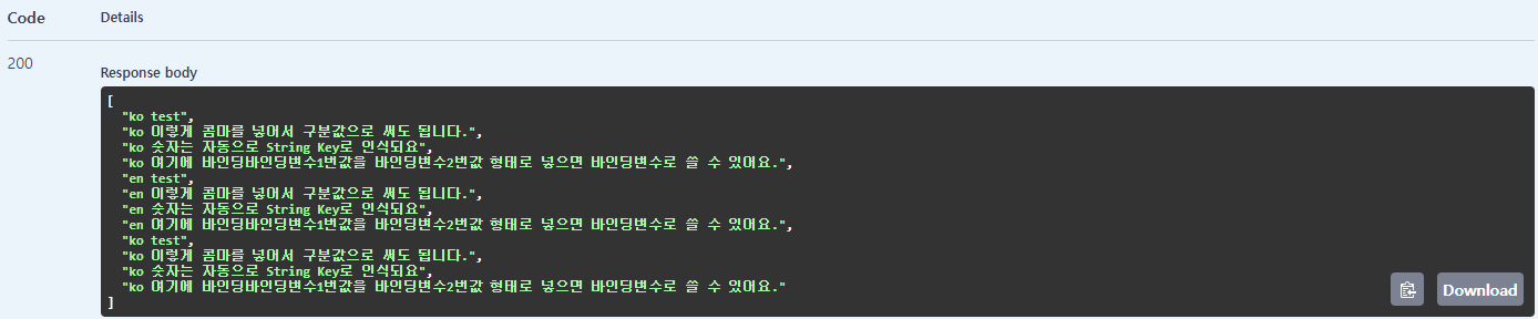 replace.test=en 여기에 {0}값을 숫자 {1} 형태로 넣으면 치환변수로 쓸 수 있어요.